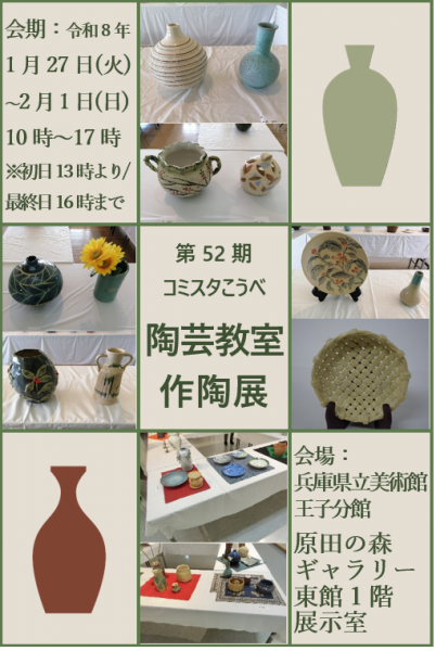 1月27日(火)から2月1日(日)まで、兵庫県立美術館 王子分館 原田の森ギャラリー東館1階展示室にて、「第52期 コミスタこうべ 陶芸教室 作陶展」を開催いたします。