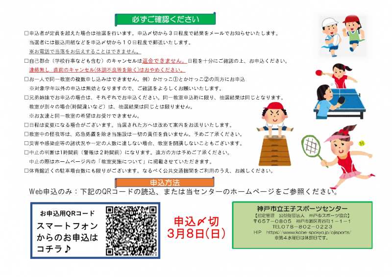申込後、応募自体をキャンセルする場合はお手数ですが体育館 078-802-0223 までいただけますと幸いです。