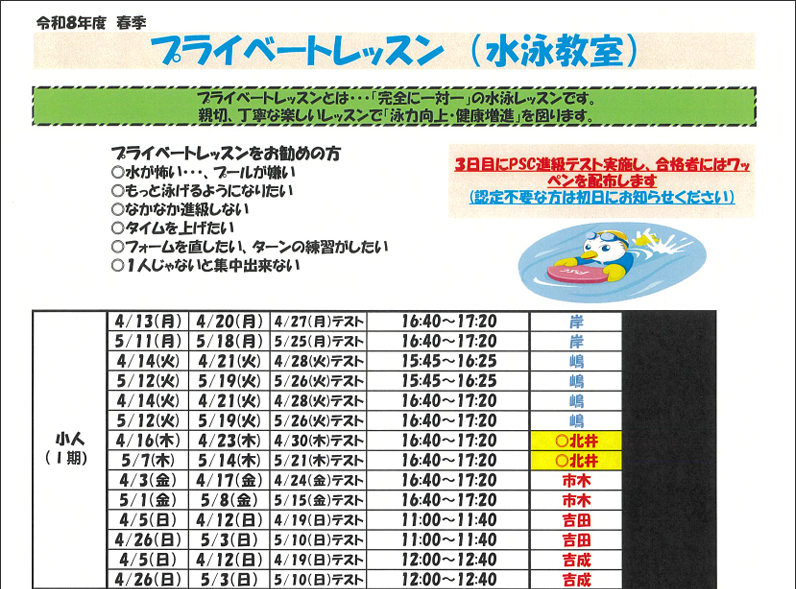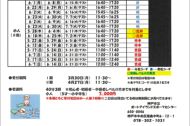 ●持ち物・・・水着、水泳キャップ、ゴーグル、バスタオル、受講証