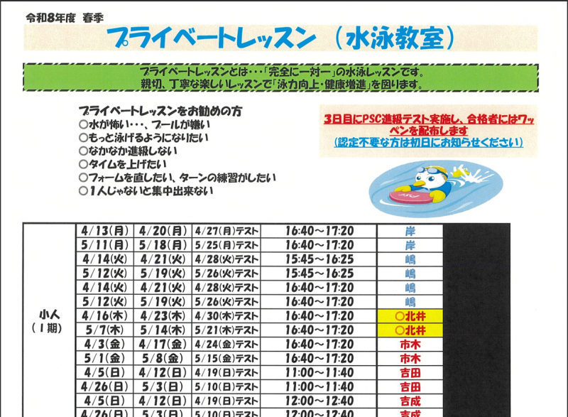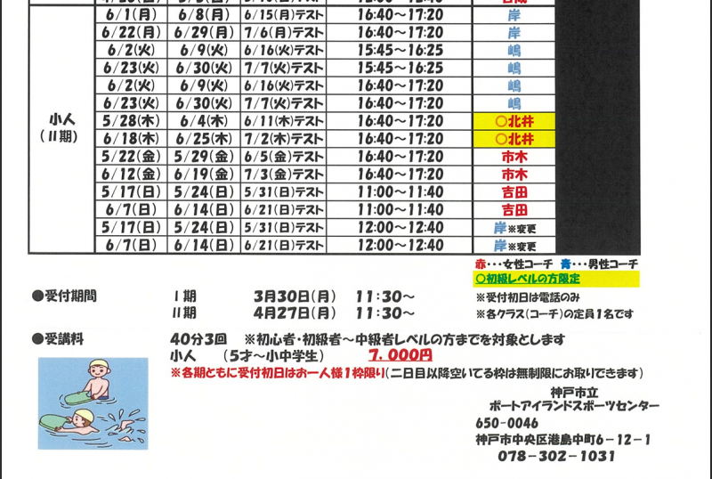 ●持ち物・・・水着、水泳キャップ、ゴーグル、バスタオル、受講証