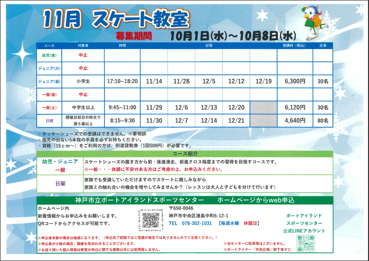 従いまして、【11月スケート教室 一般(土)】クラスは当初通り開催いたします。