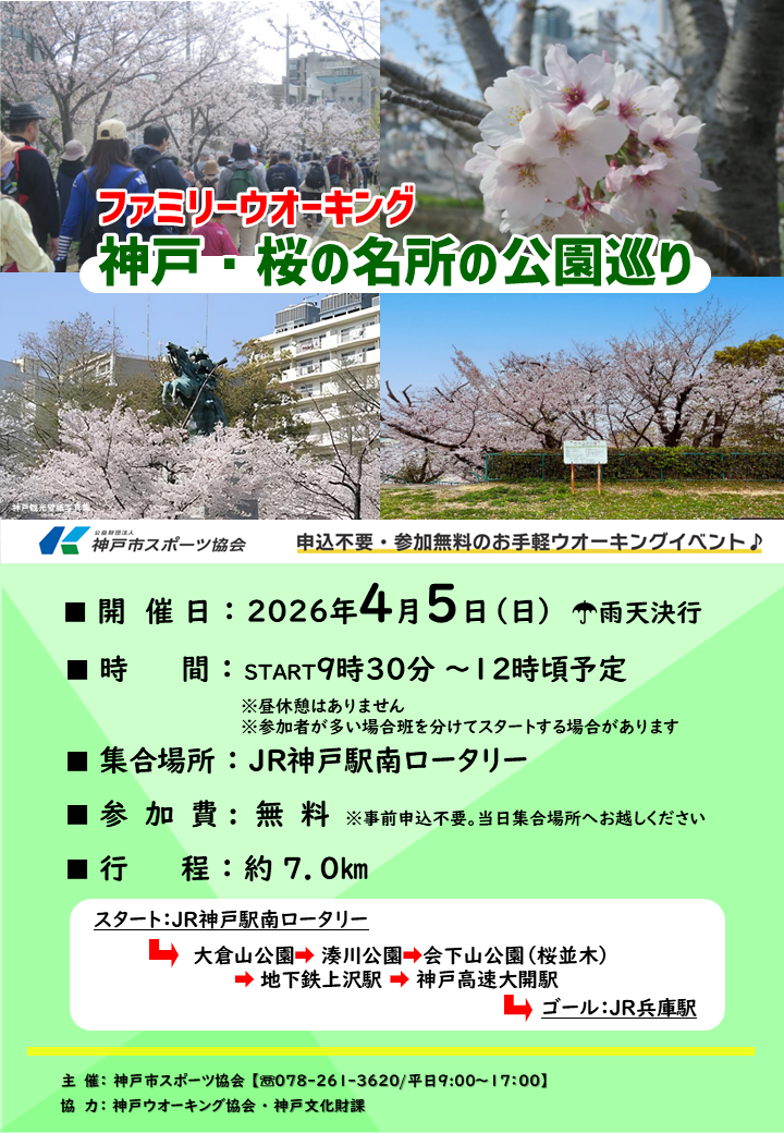 4/5ファミリーウオーキング『神戸・桜の名所の公園巡り』を実施します!